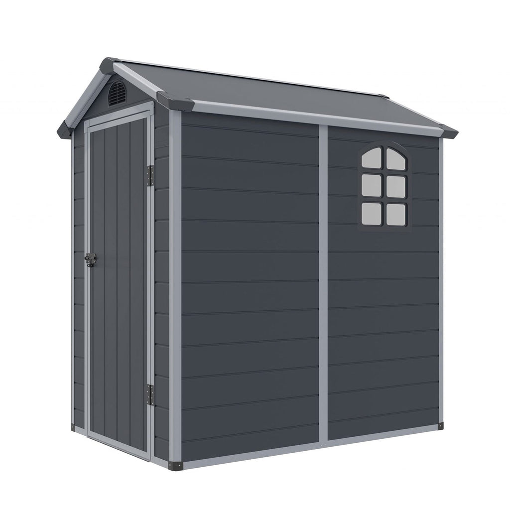 This modern Airevale Plastic Apex Shed 4ft x 6ft uses low maintenance, UV-treated polypropylene to create a sturdy structure. It can be bolted down to a solid concrete base and for added security, you could add a padlock (not included) to secure the door.
