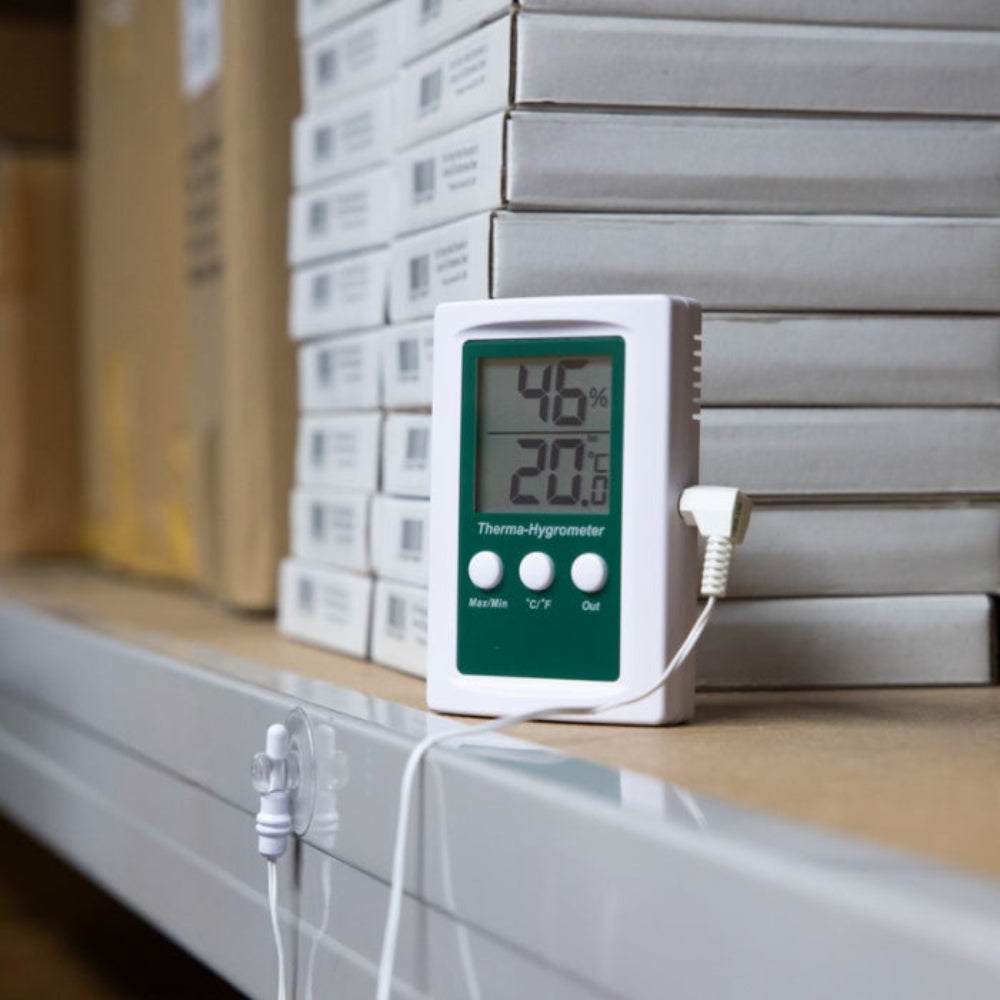 The device simultaneously monitors temperature and humidity levels while recording maximum and minimum readings. The external probe extends temperature monitoring capabilities beyond the main unit's range, providing comprehensive environmental data.
