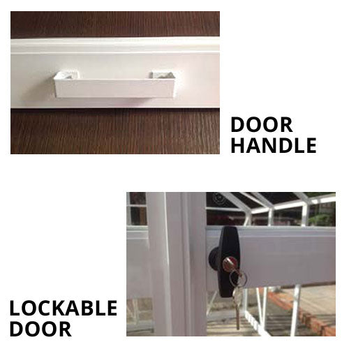 These greenhouses also come as standard with many useful and attractive features, such as an integral 5 inch high aluminium base, generous double doors with handles and key lock, complete with low threshold access, a 10 bladed louvre kit, canopy seals, cantilevers to all bars, bar capping to all bars and roof opening windows.