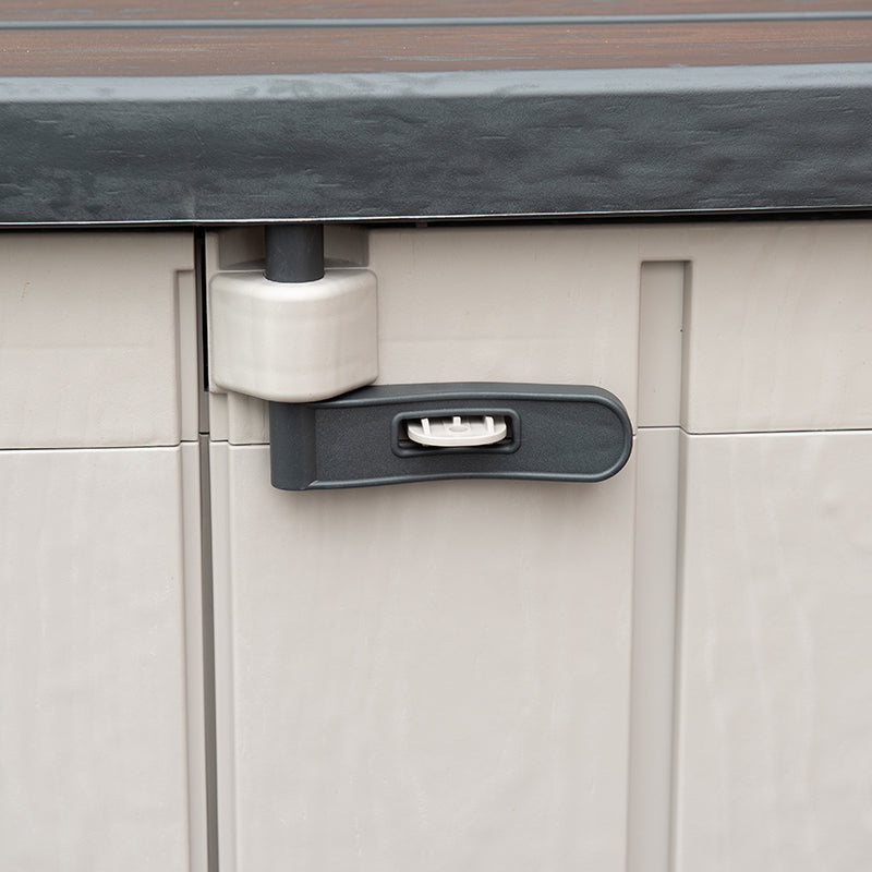 Fully Opening Front Doors And Lid - allowing access to the whole interior of the store. The lid benefits from having two gas pistons that provide assisted lifting of the lid and keep it open when required. The turn handle at the front secures both doors and lid closed and can be locked with the use of a padlock (not included) to keep the contents safe.