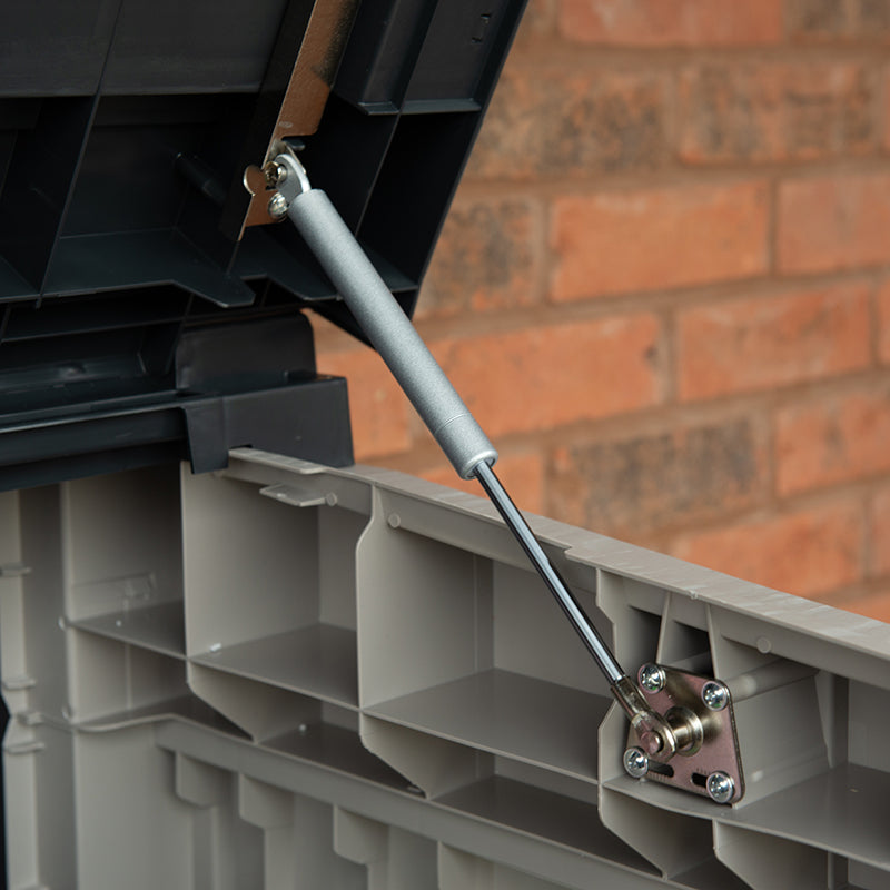 The lid of the store benefits from having two gas pistons that provide assisted lifting of the lid and keep it open when required. Made from UV-resistant polypropylene that will not rot or suffer from sun damage, this store will provide years of use without the need for any maintenance.