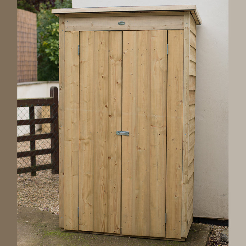 This tall garden store is manufactured from traditional pressure-treated overlap panels and finished with smooth-planed barge boards and shiplap tongue and groove panels on the front. The felted pent roof keeps the store weathertight and can be assembled sloping backwards or forwards to suit personal preference and position. The store is also mounted on pressure-treated bearers to keep it off the ground and dry.