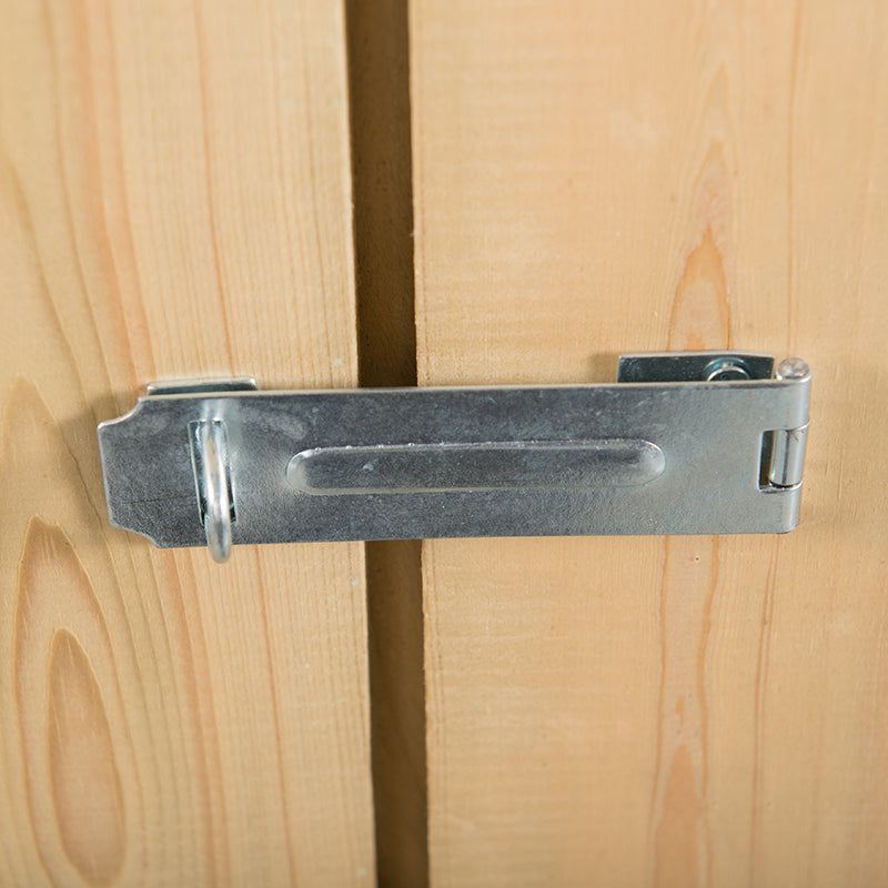 Sturdy Double Doors - with hidden hinges for additional security. The doors have a plate hasp and staple latch which could be secured with a padlock (not included). The opening door width is 26 inches / 66cm.