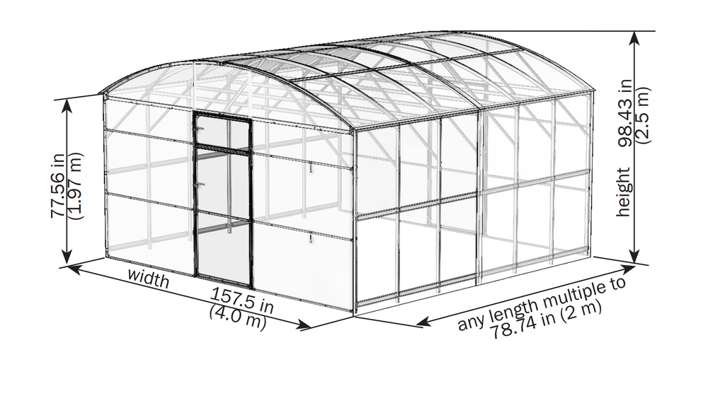 The greenhouse measures 4 metres in width, and 2.4 metres in height, giving a total area of 16 square metres. The distance between arches is 67 cm, and the straight wall height is 1.97 metres, providing generous space for taller plants and climbing varieties. Top third of doors can be opened for airflow in hot weather and allows in pollinators