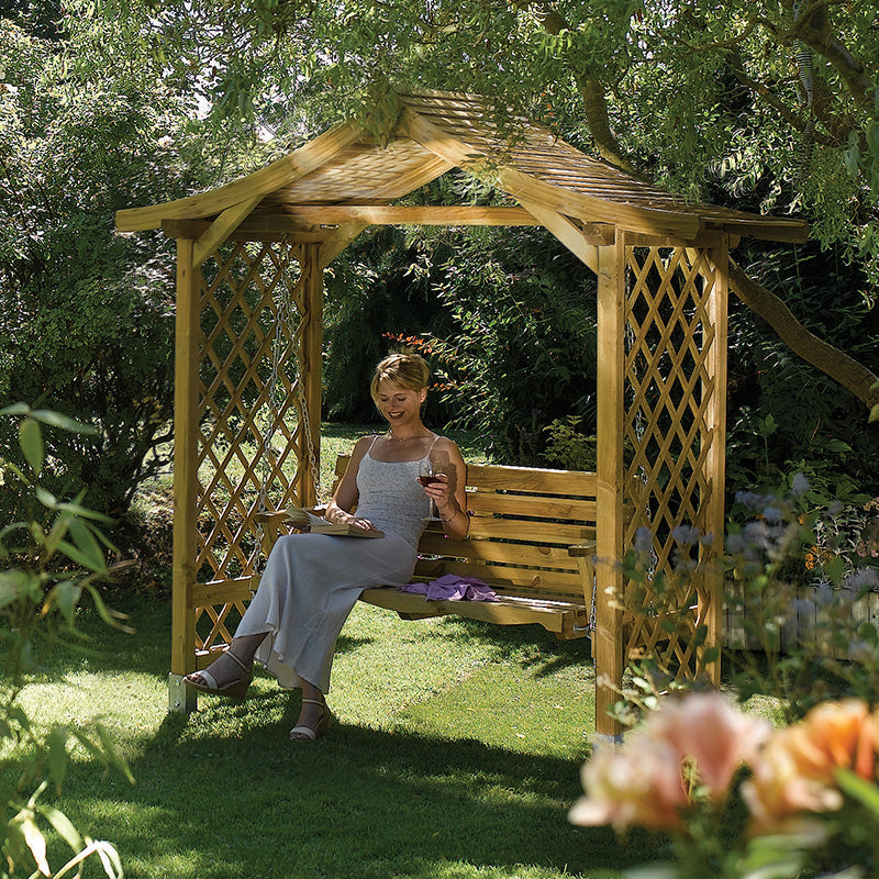 Create a stunning focal point in your garden with this swinging Dartmouth Arbour. Featuring lattice sides and an apex roof this swinging arbour makes a great place for you to relax and enjoy your garden. Supplied with rust-resistant galvanised base fittings.