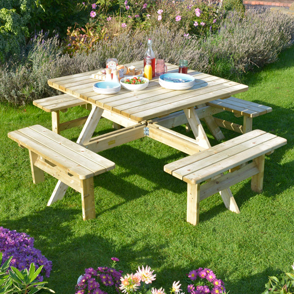A practical alternative to a traditional rectangular table, this modern Square Picnic Table from Rowlinsons includes a table with attached benches to accommodate up to eight people. Being 6ft 6 inches square makes this picnic table ideal for smaller gardens, whilst its pressure-treated timber and sturdy design ensure years of use.