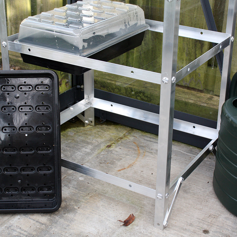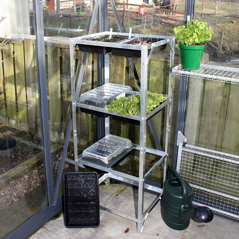 Combining a durable aluminium framework and quality 2 inch deep seed trays it increases your growing space three fold making it ideal for smaller greenhouses. Being only 20" wide it fits neatly in one glazing section of a greenhouse, it's 16" back to front and stands 48" tall, so whilst being compact enough to squeeze into a small space its overall height with its four levels still gives you lots of propagation space.