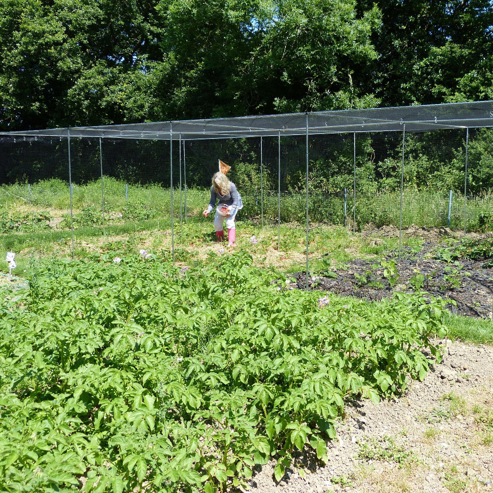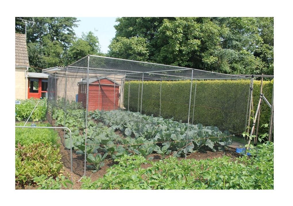 Fruit Cage Netting: 17mm x 17mm side mesh 20mm x 20mm roof mesh Bee-friendly large holes Protects against birds and animals Vegetable Cage Netting: 7mm x 5mm mesh, prevents cabbage white butterfly available in black and green