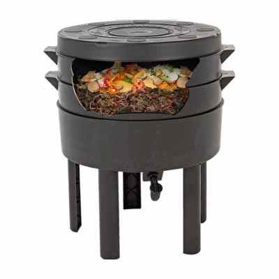 This clever design incorporates built-in mounds to encourage worms to move from the collector trays to working trays, features a unique flow-through ventilation system to maximise performance and no mess extras like well-designed legs and a drip-free tap.
